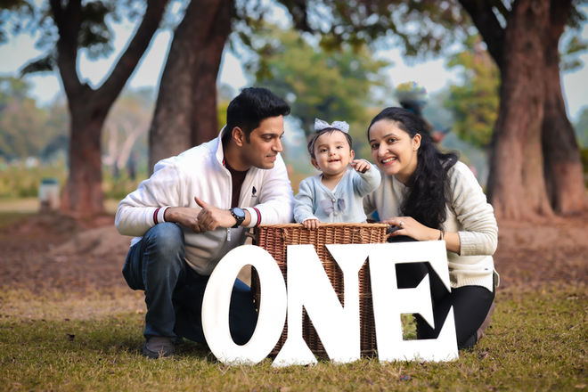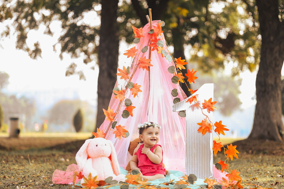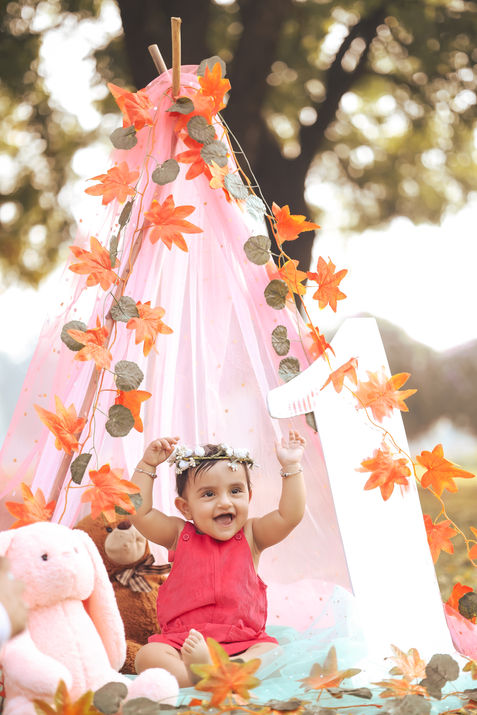 A delightful collection of images capturing children's celebrations, including a first birthday with autumn-themed decorations, a baby in a blue dress, and a child laughing in a colorful outdoor tent setup.